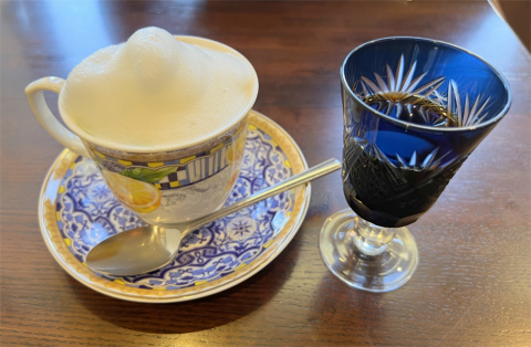 ミルク珈琲はミルクとコーヒーが別々の容器で出てきます。泡立ったミルクが入ったコーヒーカップの中に江戸切子のグラスに入ったコーヒーを注ぐようになっており、注ぐコーヒーの量によってミルク珈琲の味が変わります。ホイップされたミルクに濃厚な水出しコーヒーは上手くマッチしておりなかなか美味しいミルク珈琲でした。