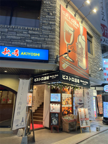 「ビストロ酒場MarineClub (マリーンクラブ)」はビルの2階にあり、同じビルの1階には「やきとりの名門 秋吉」地下1階には「ハマ酒場」があります。