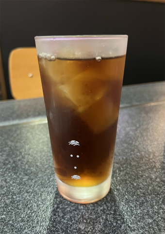 「広島お好み焼き・鉄板焼き空島」のお店の中へ入ると先客は2組おりました。お店の方に1人で来たことを告げると4人掛けのテーブル席に案内されました。まずはウーロン茶を注文。メニューの中から広島お好み焼き 肉玉そば・牛スジを注文、これを食べた後、もう少し食べたかったので牛スジ煮込み(ポン酢)を注文しました。