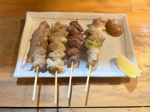ウーロン茶と一緒にお通しが出てきました。あまり好きそうではなかったので手を付けず。本日のお刺身4点盛り合わせはマグロ、ホタテ、イカ、タイでしたがもともと冷凍されていたのでしょうか、きちんと解凍できていないと思われたものかあったのが非常に残念でした。焼き鳥は肉(正肉)、ねぎ肉(ねぎま)、カワ、すなぎもはどれも焼き方や塩加減も良くて美味しいです。1本150円という値段は場所を考えると安いかと感じました。もう少し食べたかったのですがお腹いっぱいになってしまいました。「焼鳥 鳥末 」は機会があればまた食べに行きたいですね。ごちそうさまでした。