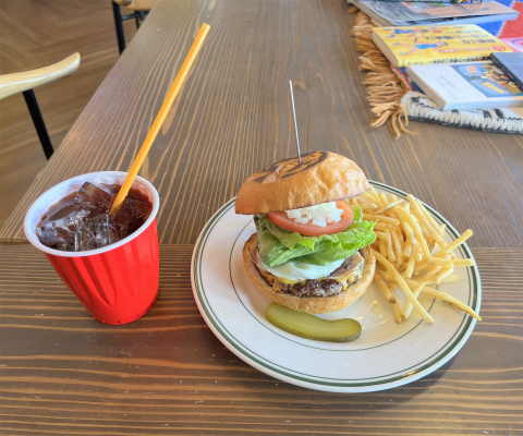 ベーコンンチーズエッグバーガーを食べてまず感じたのはバンズが良かったこと、そしてパテは肉感、肉肉しいというのでしょうかがたっぷり感じられましたが、胡椒が少しだけ強いように感じました。トマト、レタス、タマネギも入っており、ピクルス、ポテトも添えられておりました。ハンバーガーの全体的なバランスも良く、添え物の細いポテトもなかなか美味しくいただきました。1人か2人用のテーブルでもあってゆっくり食事が出来ればと思いましたが、これはスケートパーク付属のハンバーガーショップということを考えると無理なのでしょう。こういった希望があればテイクアウトで食べるか、別のハンバーガーショップに行かれた方がいいかもしれません。