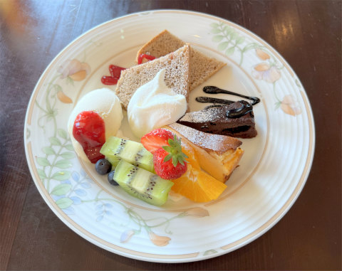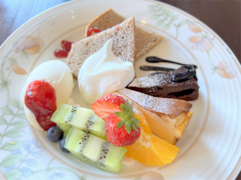 出てきたケーキ3種取り合わせは盛り付けが非常に綺麗でカラフルですね。ケーキ3種取り合わせというメニューの名前でしたのでケーキが3種類皿の上に乗っただけかと思っていたら3種類のケーキであるチーズケーキ、チョコレートケーキ、シフォンケーキ以外にキウイ、いちご、オレンジ、ブルーベリー?などのフルーツにアイスクリームが乗っておりました。ケーキはどれも美味しく、特にシフォンケーキが食べた中では個人的には良かったと感じました。女性客が多いのも頷けます。食事メニューもあるようですので機会があれば食べに行きたいですね。ごちそうさまでした。
