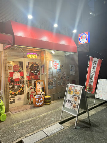 この日は常盤平駅近くで仕事がありました。帰りに五香駅近くで何か食べて帰ろうと考えながら歩いていると見つかったのがネオンでひときわ明るいお店を見つけました。「J&N AMERICAN DINER」の幟があり、メニューの立て看板を見るとハンバーガーショップであることが判明しました。今日の夕食はここでいただくことにしましょう。